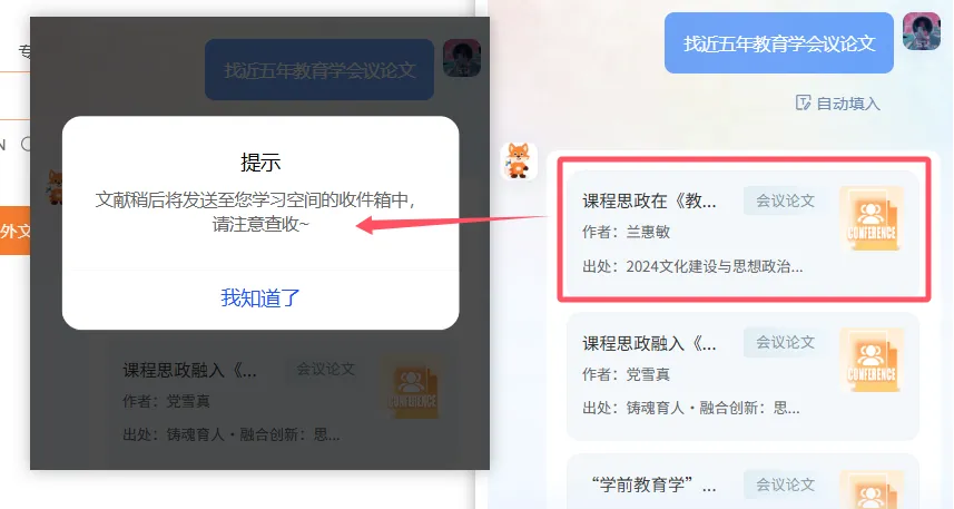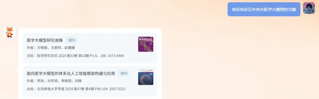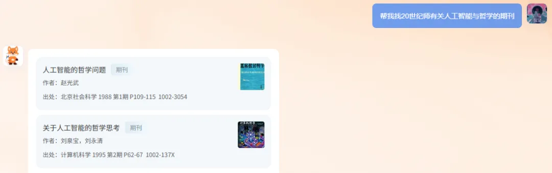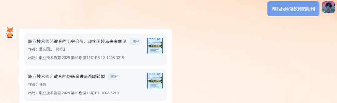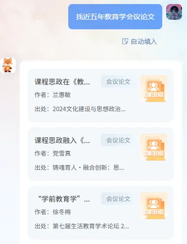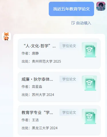 有精准信息就输入题名 / DOI / ISBN,没精准信息就说清需求(比如 “找近五年教育学论文”)