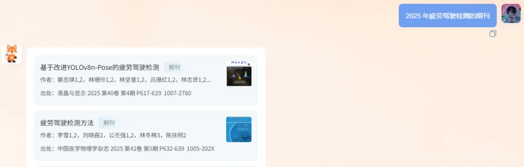 ✅要限定时间:“2025 年疲劳驾驶检测的期刊”→ 明确时间后,直接返回对应时段资源;